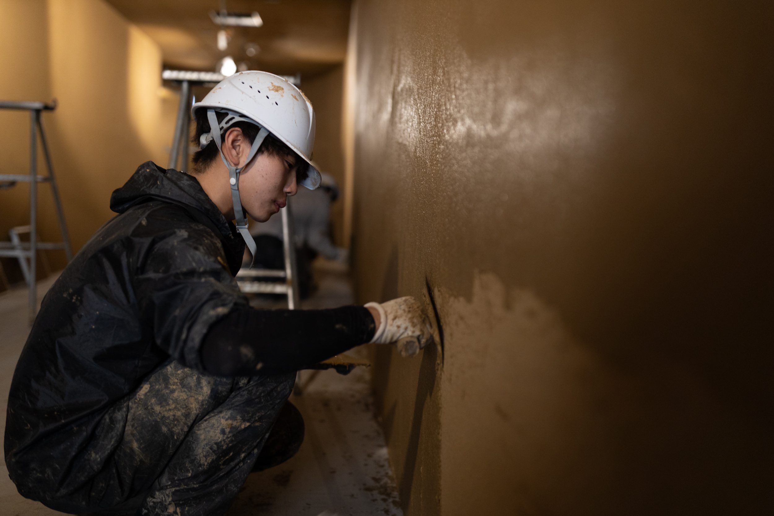 会社は少数精鋭で運営しており、仲間と密なコミュニケーションが取りやすい環境です。左官は一度手に職がつくと、ずっと活躍できる仕事です。